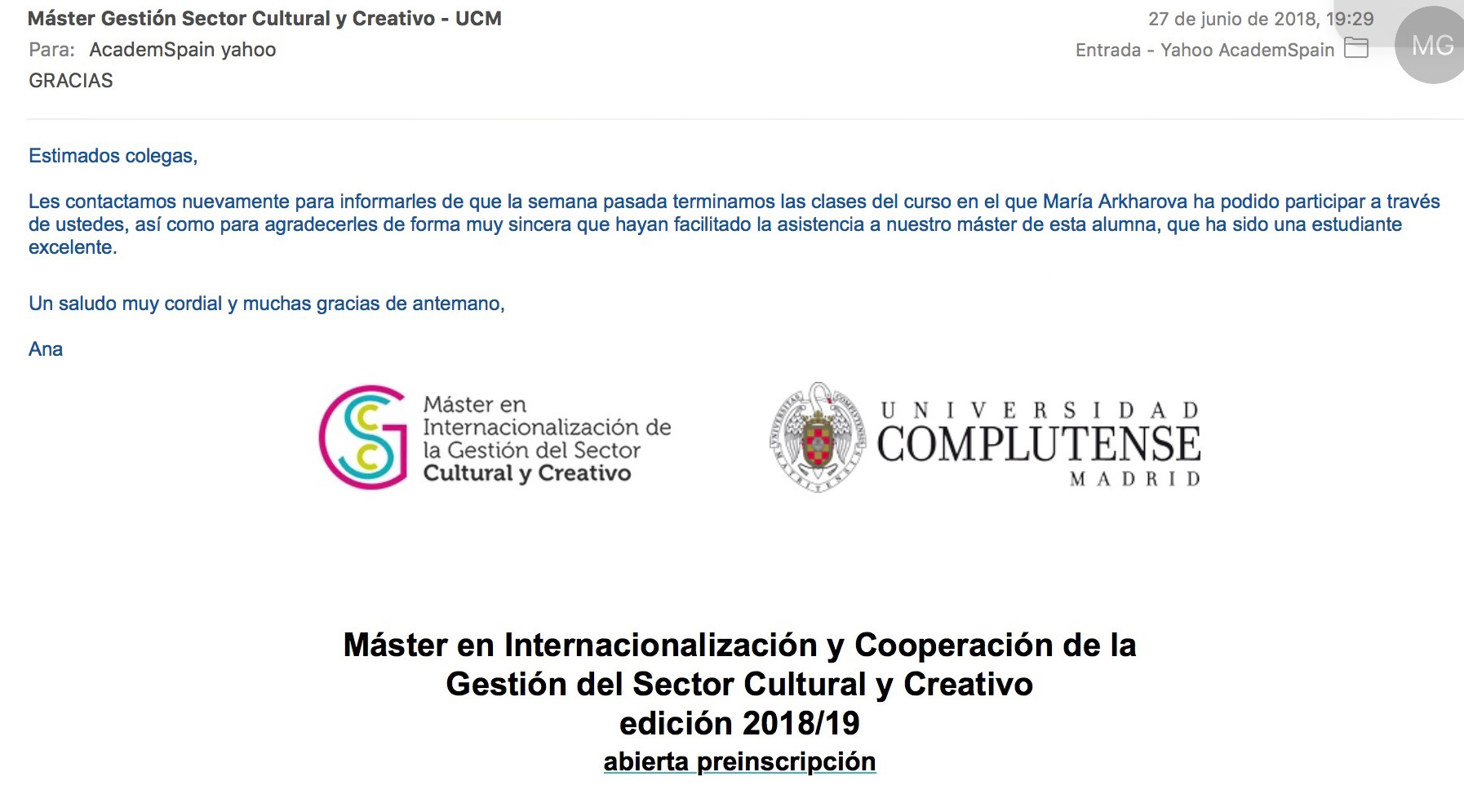 А это письмо мы получили от Университета Комплутенсе, по окончании программы Марии, где нас благодарят за такую замечательную учащуюся как Мария, которая проявила себе на программе блестящей студенткой.